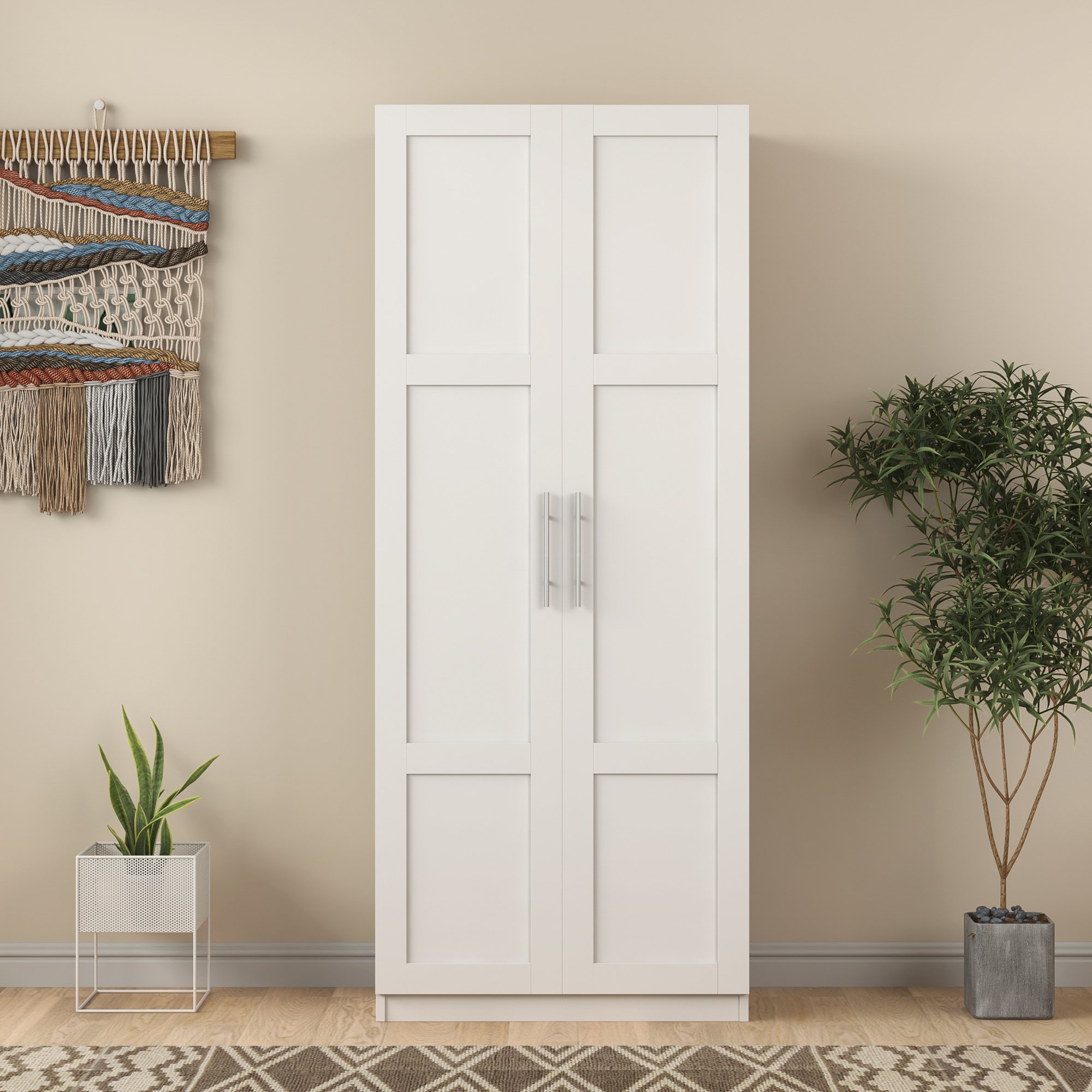 High wardrobe and kitchen cabinet with 2 doors and 3 partitions to separate 4 storage spaces; white
