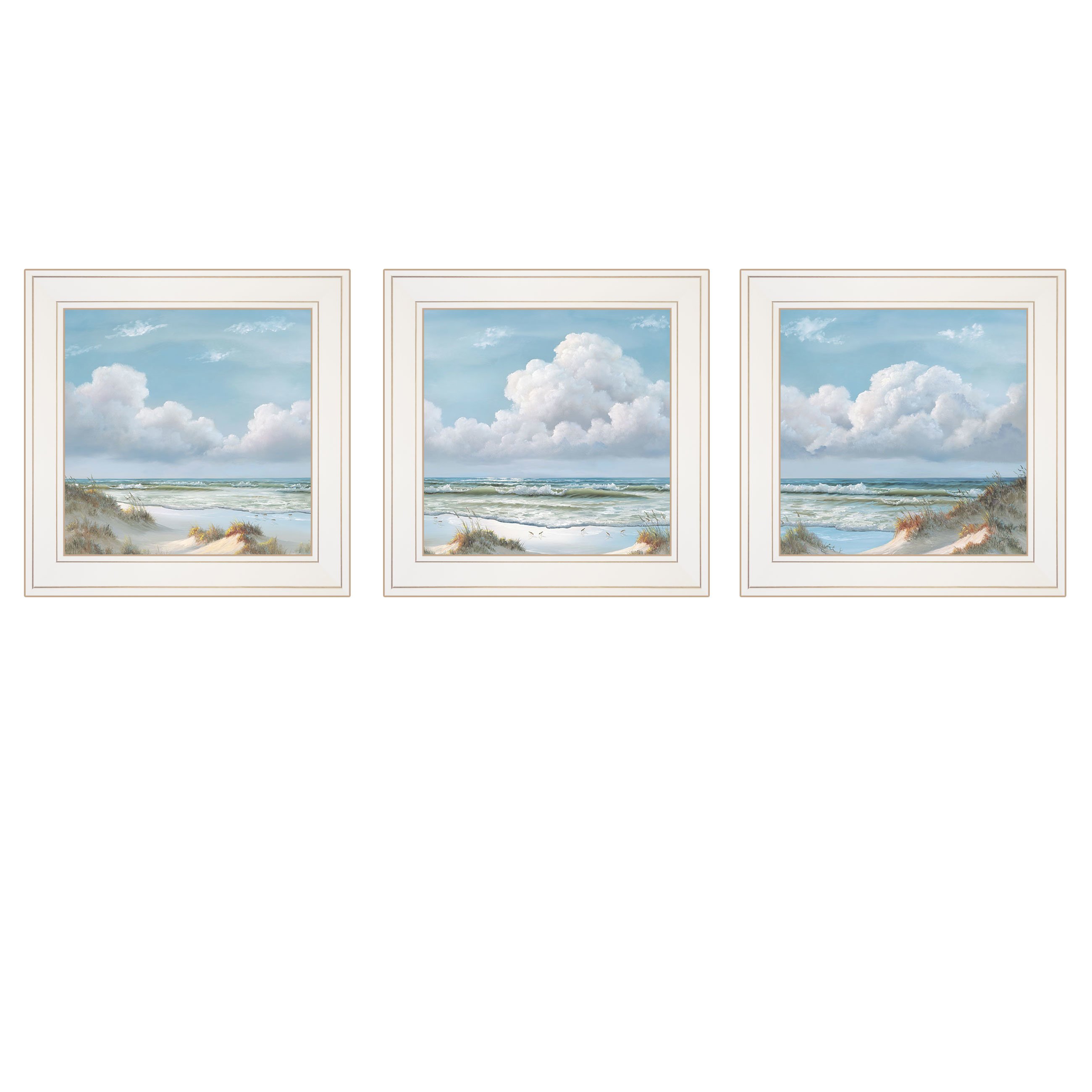"Beautiful Day I,II, III" by Georgia Janisse. This decorative white framed Triptych of 3-15x15's display the ocean, waves, sand and a beautiful day at the beach. Crafted By Skilled American Crafters And Coated With A Fade-resistant Texture, This Piece Has A Canvas-like Appearance That Will Last For Years To Come. Invest In A Piece That Is Truly One-of-a-kind.•Transform your walls with this stunning piece of art and bring a touch of modern elegance to your room. This stunning piece will not only add visual interest to any room but it's minimalist design will bring a sense of serenity to your space.•Tired of dull, empty walls in your home? We believe that walls should inspire, not bore. That's why we offer a wide range of wall art to suit any space from bedroom and kitchens to office and beyond. Give your walls a facelift with our printed arts and transform your space into a stylish and inviting home.•This framed wall art is hand-crafted in the USA of high-quality wood with the surface of the art coated with a fade-resistant texture which gives it a canvas-like appearance for many years of enjoyment in your home.•Bring a pop of colour and style to any room with our fully assembled and ready-to-hang wall art. With a wide selection of decorative pieces to choose from, you'll easily find the perfect match for your personal taste or to give as a thoughtful gift. Don't miss out on the opportunity to add some unique charm to your space.•Experience the unmatched quality and durability of American-made craftsmanship with this individually hand-crafted wall decoration art. Skilled crafters put their expertise into every piece to ensure it will stand test of time and bless your eyes for years to come.