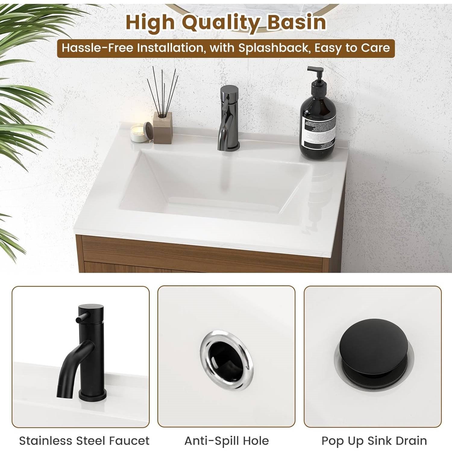 Experience the ultimate convenience with our Mid-Century Modern Bathroom Vanity in Walnut Wood Finish with Sink! This set includes a bathroom storage cabinet complete with a sleek sink, a stainless steel faucet, a pop-up drain, and essential accessories. The glossy sink's curved shape ensures swift water drainage, while the user-friendly pop-up drain adds a touch of ease to your routine. With a thoughtfully designed 2-door cabinet and an open shelf, this set offers ample storage space for toiletries, towels, and beyond. As an added security measure, we provide two anti-toppling devices, allowing you to securely fix the cabinet to the wall. Elevate your bathroom experience with this comprehensive and stylish vanity sink combo set.