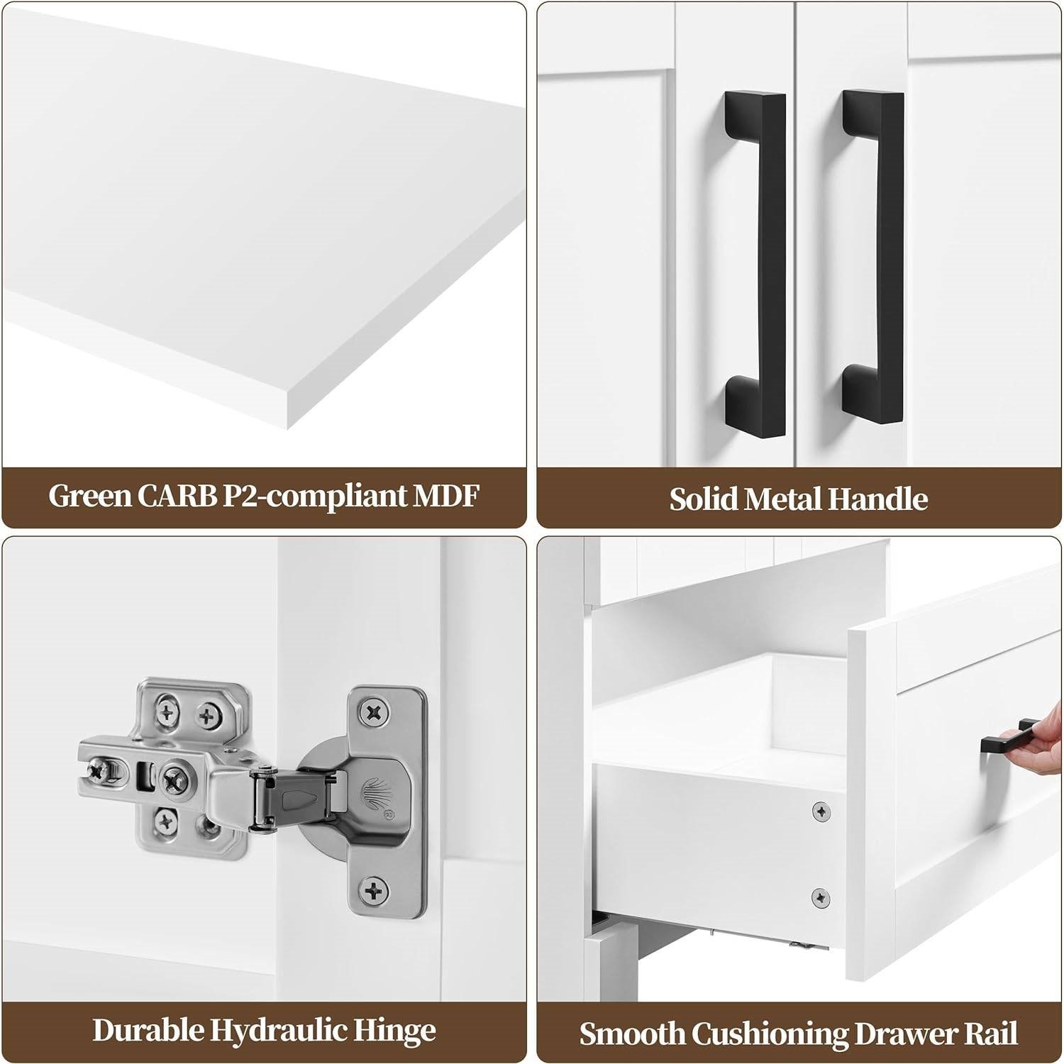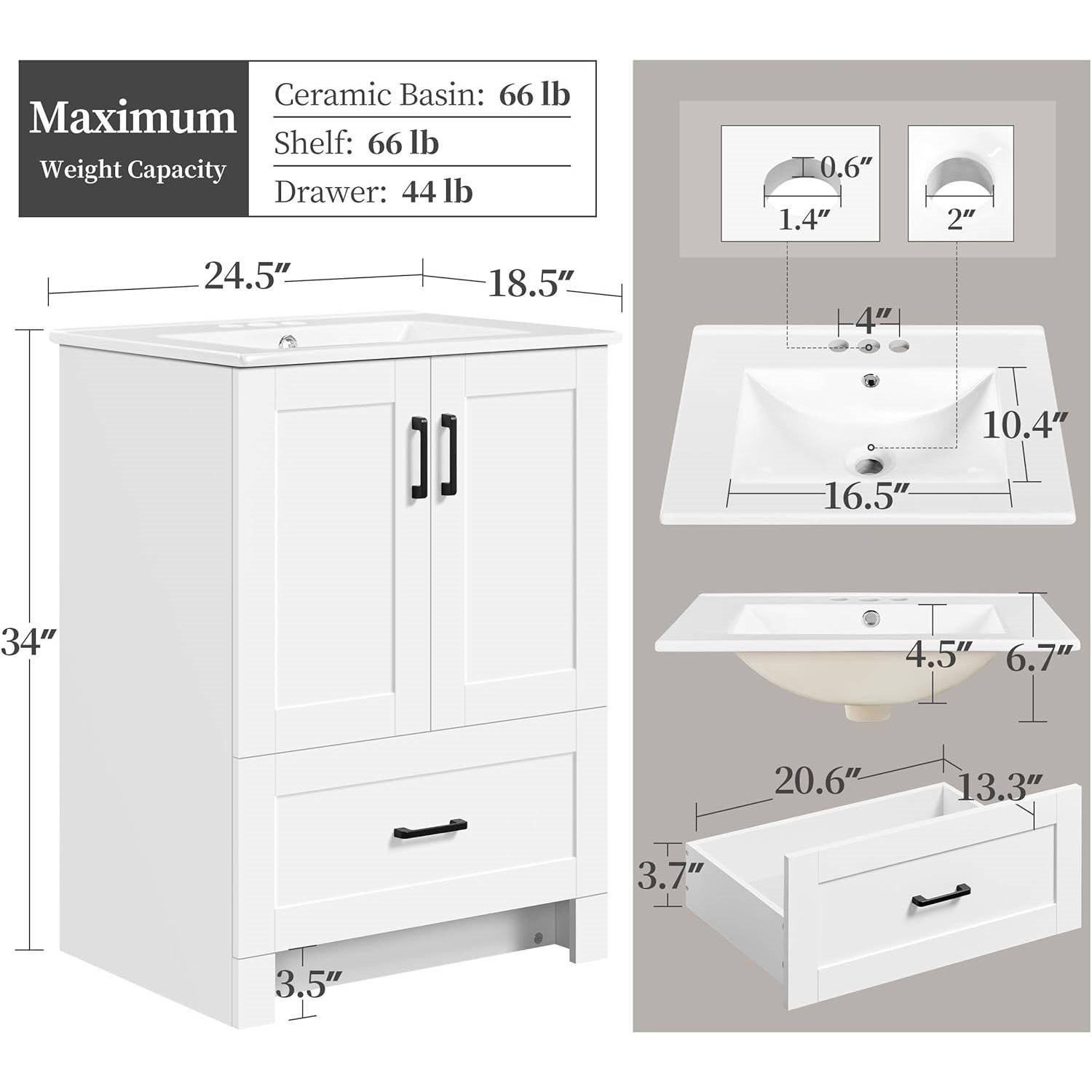 This White Wood Finish Bathroom Vanity with Ceramic Sink is known for its durability and resistance to scratches, stains, and fading, it is a durable ceramic sink with a smooth waterproof surface, easy to clean, and daily maintenance for a lasting performance. The 34″ height bathroom vanity is made of CARB P2-compliant MDF and a freestanding ceramic sink, which makes its structure more durable and sturdy without the risk of cracking, withstand greater pressure, and works well for a long service life. This sink storage cabinet has a soft closing design for the cabinet door ensuring quiet and smooth closure without any noise, even when closed quickly. Ceramic is water-resistant and can withstand exposure to water without deteriorating or warping, making it ideal for use in a bathroom setting and easy to clean with a damp cloth. This storage cabinet helps you organize your sundries to give you a neat space. Elegant design with a white appearance and matching three metal handles, the whole appearance looks fancy and elegant and fits in any decoration.