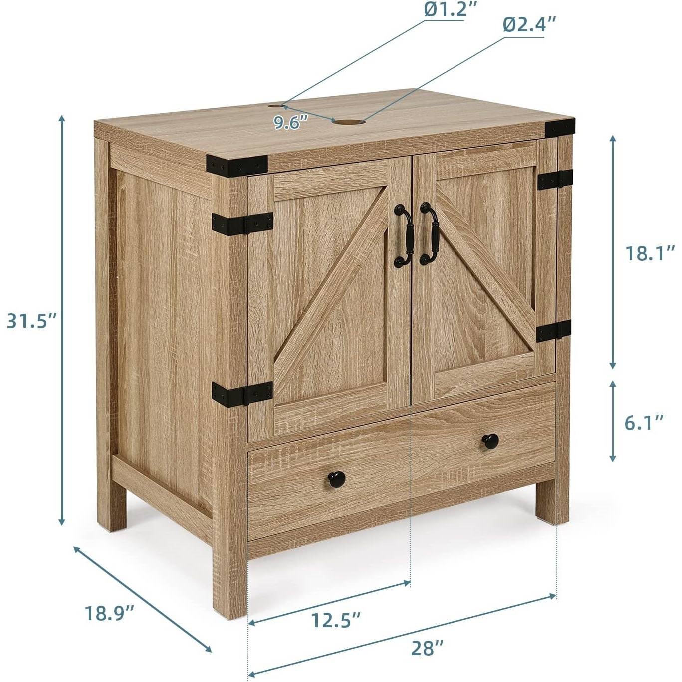 This Farmhouse Wood Finish Bathroom Vanity w/ Blue Glass Sink Black Faucet and Drain is made of Eco-MDF wood for long-lasting durability. Careful Coverage and Eco paint enable durability. Cabinet: 19"x 28"x 31.5"(D×W× H); Sink dimension: 21" x 6.3" (W xD); Bowl thickness: 0.5". Scratch-resistant & Polished surface is easy to clean up. Come with Vanity, Glass sink, ORB Faucet, Pop up drain, Hot/ cold lines, and some mounting hardware. Modern and stylish design fit perfectly with most bathroom decor; Easy installation.
