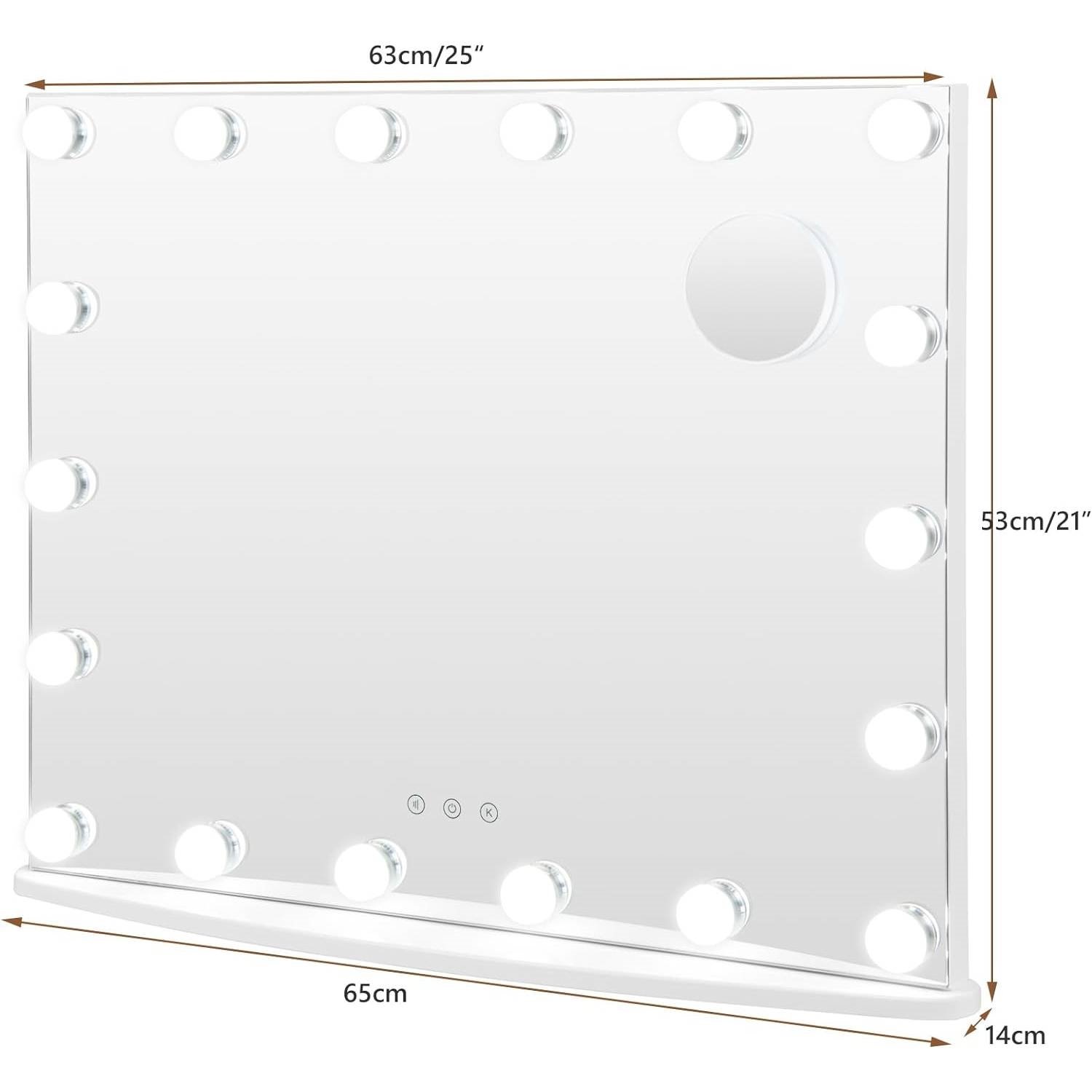 This 21 x 26 in Bathroom Mirror w/ Dimmable Lights + Removable 3X Magnifying Mirror is surrounded by 18 LED bulbs, which can create soft lights and are eye-protective. With these bright bulbs, you can easily complete your exquisite makeup when the light is insufficient, such as during cloudy days or at night. This makeup mirror comes with a 3X magnifying mirror that is equipped with 2 suction cups. By freely assembling it anywhere on the mirror surface, you can make more precise makeup of your eyebrows, eye shadow, eyeliner, lip, etc. This vanity mirror provides 3 light color modes, which are cold white, warm white and warm yellow. Additionally, the brightness of light has 4 adjustments for you to choose, satisfying your different makeup needs. With a stable base that is equipped with anti-slip mats, this lighted mirror can stand on the table top. More than that, you can also mount the mirror to a wall with the back holes and included hanging accessories. Designed with a smart touch screen, this large makeup mirror is controlled by 3 easy-to-understand buttons. Just simply touch the sensors on the screen, you can easily turn on or off the lights, and select the desired color and brightness. This mirror has an intelligent power-saving function, 15 minutes without operation will automatically shut down, which can be a good energy savings.