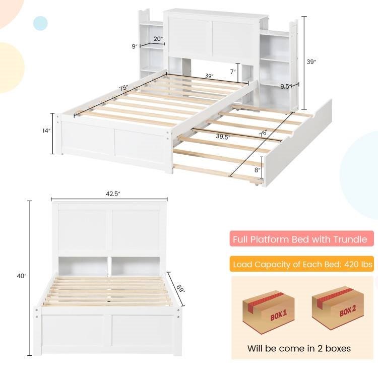 This Twin/Twin White Wooden Platform Bed w/ Trundle Storage Headboard Bookshelf is fitted with a 4-tier bookshelf on each side. Cleverly combines a platform bed with a trundle bed for guests and sleep overs! To maximize the space, the platform bed includes smooth and stable wheels to support the rolling trundle and 2 mobile bookcases, allowing for saving more space. Cutout handles included also make pushing and pulling easier. The headboard perfectly creates large storage. This platform bed requires no box springs and the recommended thickness of the mattress is 8"-12".