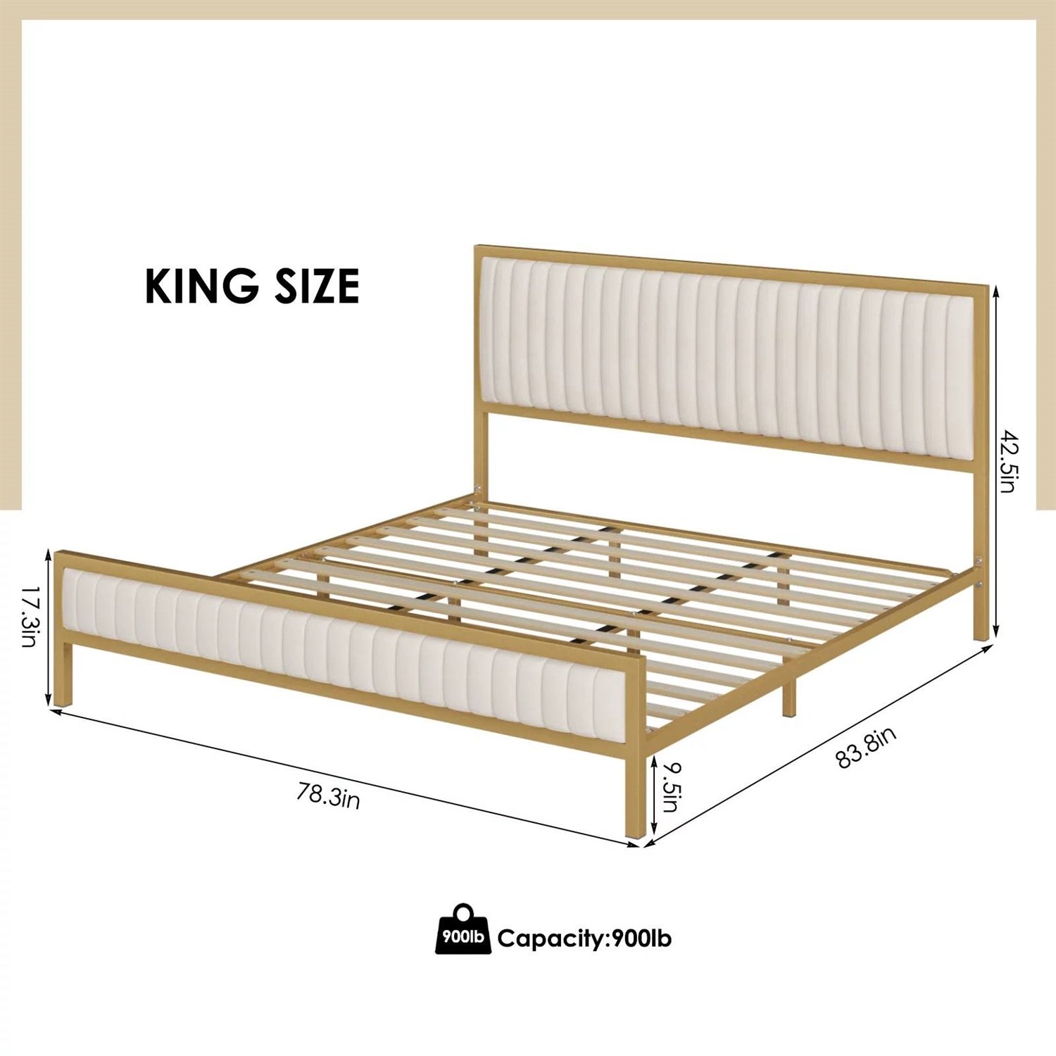 The headboard and footboard of this King size Gold Metal Platform Bed Frame with Beige White Upholstered Headboard are designed with minimalistic yet classic vertical channel tufting and filled with high-quality sponge for exceptional coziness. A premium golden lacquered metal frame, seamlessly combined with luxurious velvet fabric, gives your bedroom a regal ambiance. No matter if your style is modern or vintage, it is the perfect choice to decorate your room. The platform bed features a heavy-duty steel frame and 11 thickened solid wood slats firmly attached with metal screws that can support up to 1000 lbs, making it more comfortable and supportive for your mattress without a box spring, thus saving your money. Provide a reliable foundation for a good night's sleep (recommended mattress: 8"–14"). Extra-special silent strips are thoughtfully designed to reduce noise and strange squeaks between the slats and the bed frame. Plus, the soft padding under each metal leg effectively prevents your floor from being scratched and absorbs sound. This modern bed frame will bring you a quiet night. The bottom of the bed frame is 9.5” from the floor, so you can store some boxes, clothes, or shoes to keep your bedroom clean and tidy. The queen bed frame comes in a box that includes instructions and necessary tools, all pieces are labeled. Follow the clear instructions to assemble this beds within 20 minutes.