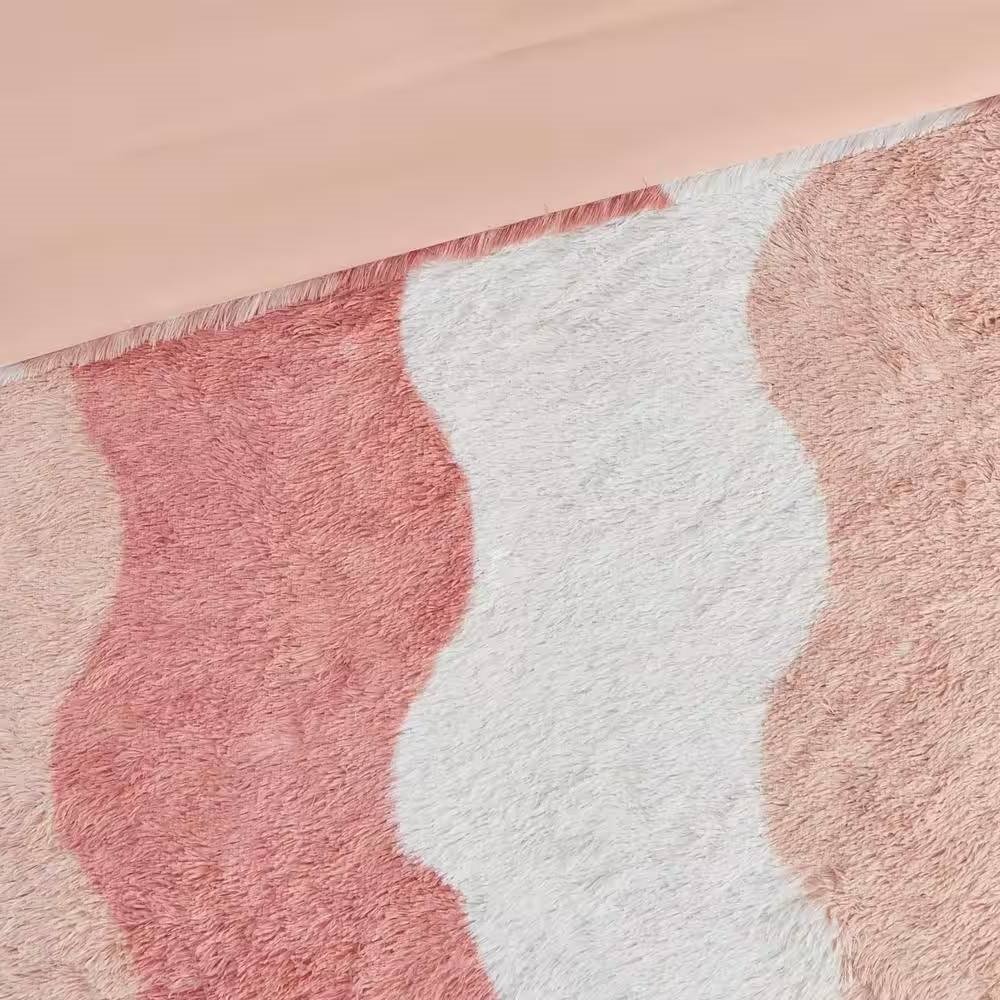 This Full/Queen Pink Blush White Reversible Soft Sherpa Faux Fur 3-PC Comforter Set showcases a unique, tonal wave striped pattern for an ombre look, and reverses to a soft blush color. This cozy comforter adds a fun and modern update to your bedroom, while coordinating shams (1 in Full/Queen) complete the bedding set. The hypoallergenic polyester comforter filling contains no allergens and is treated to be dustproof. Sham set will vary in ombre colors. This machine washable comforter set is also Fibr-Tec certified, featuring an antimicrobial treatment on the reverse, which keeps the bedding fresher longer.