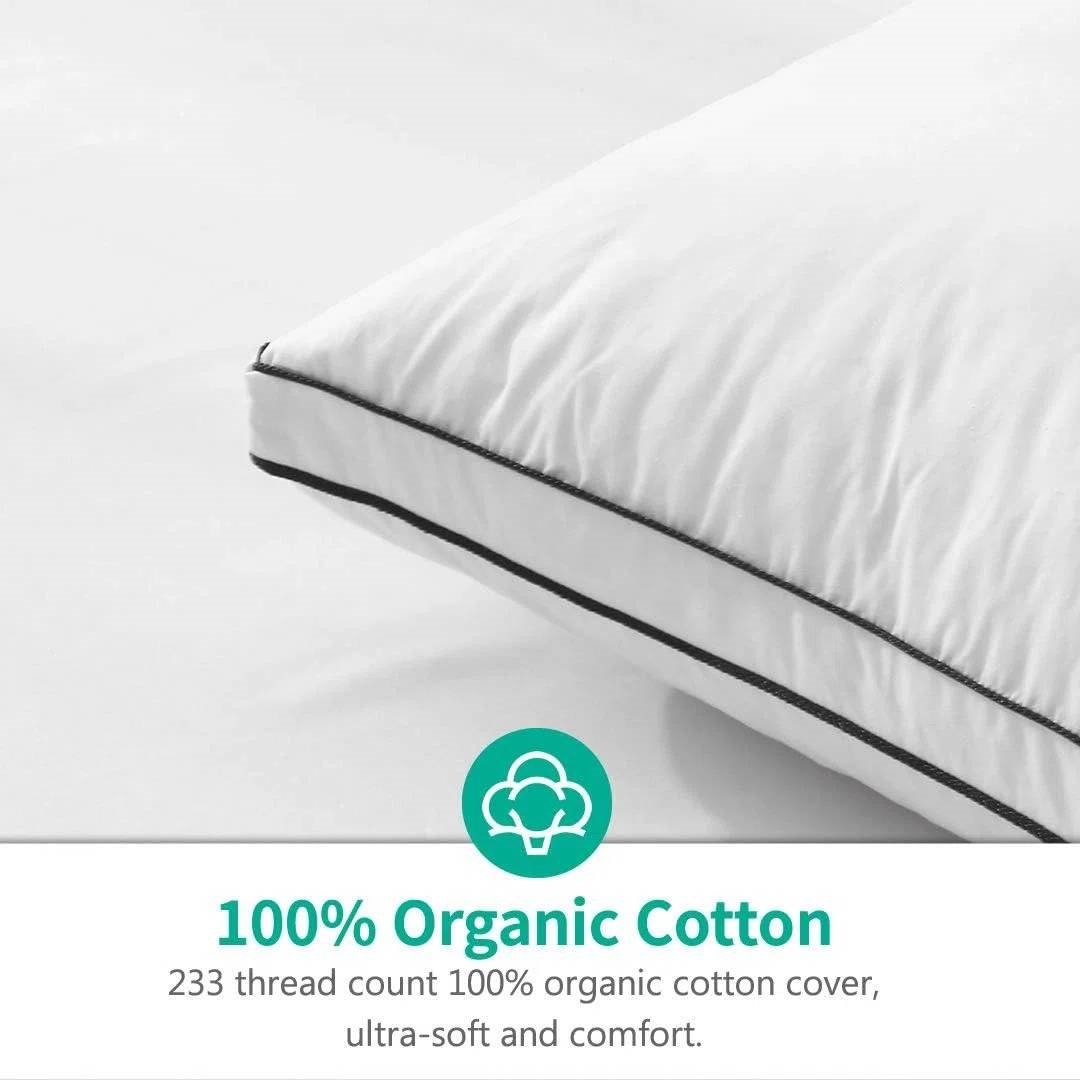 This Set of 2 King size Gusseted Goose Down Feather Pillow in Organic Cotton Fabric is made of 100% down-proof cotton fabric and premium down duck feather, classic down feather gusseted bed Pillow Insert is a breathable, durable, and skin-friendly down alternative pillow. Perfect for anyone who wants to own a pillow for 10 years or more. Filling with the softest and smallest feathers by medium density, Our down feather pillow insert is extra soft while still providing suitable support for optimum neck and shoulder comfort, so even sensitive sleepers can enjoy a cozy sleep. Perfect for most types of sleepers such as back or stomach sleepers. Quilted with 1” gusseted and decorative black piped edges, this elegant pillow can match your bed in any style. Compliant to RDS, Downpass, and OEKO-Tex Standard 100. We’re committed to making products better for you, high cleanness, odorless, cruelty-free, and sustainable. It is a good choice for family and friends, Hurray! Upon receipt, you can clap gently your pillow to recover its full shape. Recommended to regularly air them in the sun for 1~2 hours for healthier use. Recommended to use with pillowcase/sham/pillow cover. Machine washable and dryable. The pillow insert with the 233-thread-count organic cotton fabric will keep you feeling fresh all night long. Premium feathers & down filled with responsibly sourced feathers & down, soft and breathable, if you like to hug into your pillow these are for you! Soft and puffy, these gently supportive pillows feel pleasingly malleable.