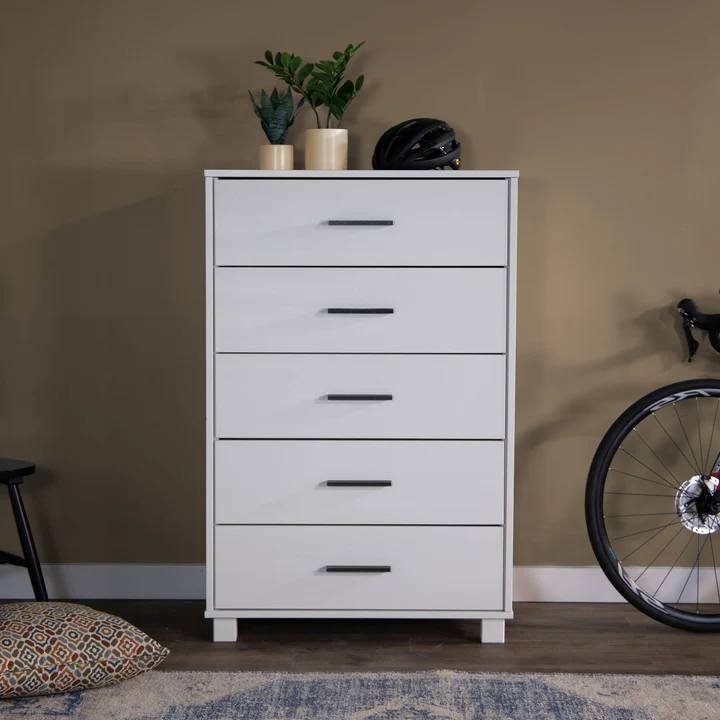 Modern Farmhouse Solid Wood 5 Drawer Bedroom Chest in White Wooden Finish
