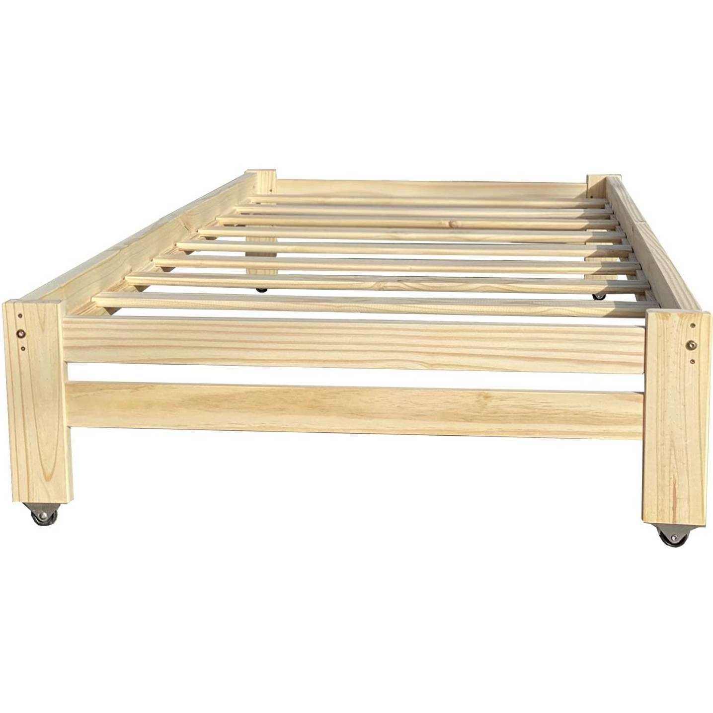 Twin size Platform Bed Frame on Casters. Minimalist design with no headboard or footboard. Great for college dorms, apartments, master bedroom, guest room, kids, teens, and adults. 350-lbs. max weight capacity. Bed rolls smoothly on 4 wheels. Wheels are removeable. Made from solid pine wood and hardwood slats. Unfinished wood bed. Ready to finish. Perfect for you wood painting project. You can varnish, paint or wax it. Or, just leave it unfinished. Each piece is sturdily built to last. Bed can be used for decades. With a simple and minimalist platform bed design, both boys and girls love this bed. Features hardwood slats to support your standard size mattress.. Mounting hardware, screws, slats and side rails are included. Philips screwdriver required (not included). Similar beds are sold at exclusive stores for more than double the price. Made with sustainable plantation grown wood with respect of the environment and wildlife. Quality furniture at affordable prices.