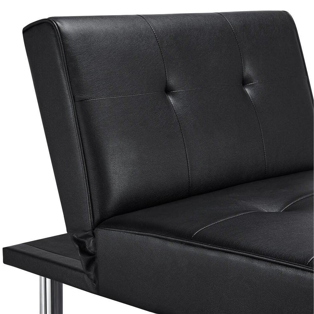 Sit back and relax in style and comfort with this Black Modern Faux Leather Chaise Lounge Sleeper Sofa. Classic faux leather upholstery features the design for a luxurious modern appeal, while tufted details give a touch of texture to the chaise lounger. Pairs well other convertible sofas. This chaise lounger has a folding contraption and the lounge back can be locked at 105 degrees for reading/TV or 140 degrees for lounging, and/or put down flat as a 65.6 inches L x 30 inches W platform bed for sleeping. This sturdy convertible chaise lounger sofa is crafted with a plywood frame, faux leather covering, foam fill, and strong metal spring for robust structure. The water-resistant faux leather upholstery and chromed plated legs can be cleaned with a damp cloth and mild cleanser. Hold up to 600 lbs. Assembly is a breeze, just 3 simple steps.