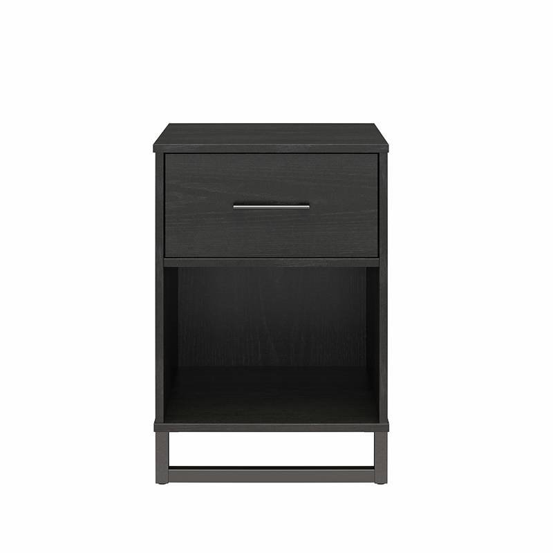 Keep your favorite items tucked neatly in your nightstand while you prepare for bed with the Modern 1-Drawer Bedroom Nightstand in Rustic Black Wood Finish with Metal Legs. This bedroom must-have consists of a large top drawer to concealed storage and a large bottom cubby for easy access to books and decor or place a folding fabric bin in there to give your room a pop of color. Room Essentials Mixed Material Nightstand requires assembly upon delivery. Complete your bedroom's look with the Mixed Material 3 Drawer Dresser and 4 Drawer Dresser.