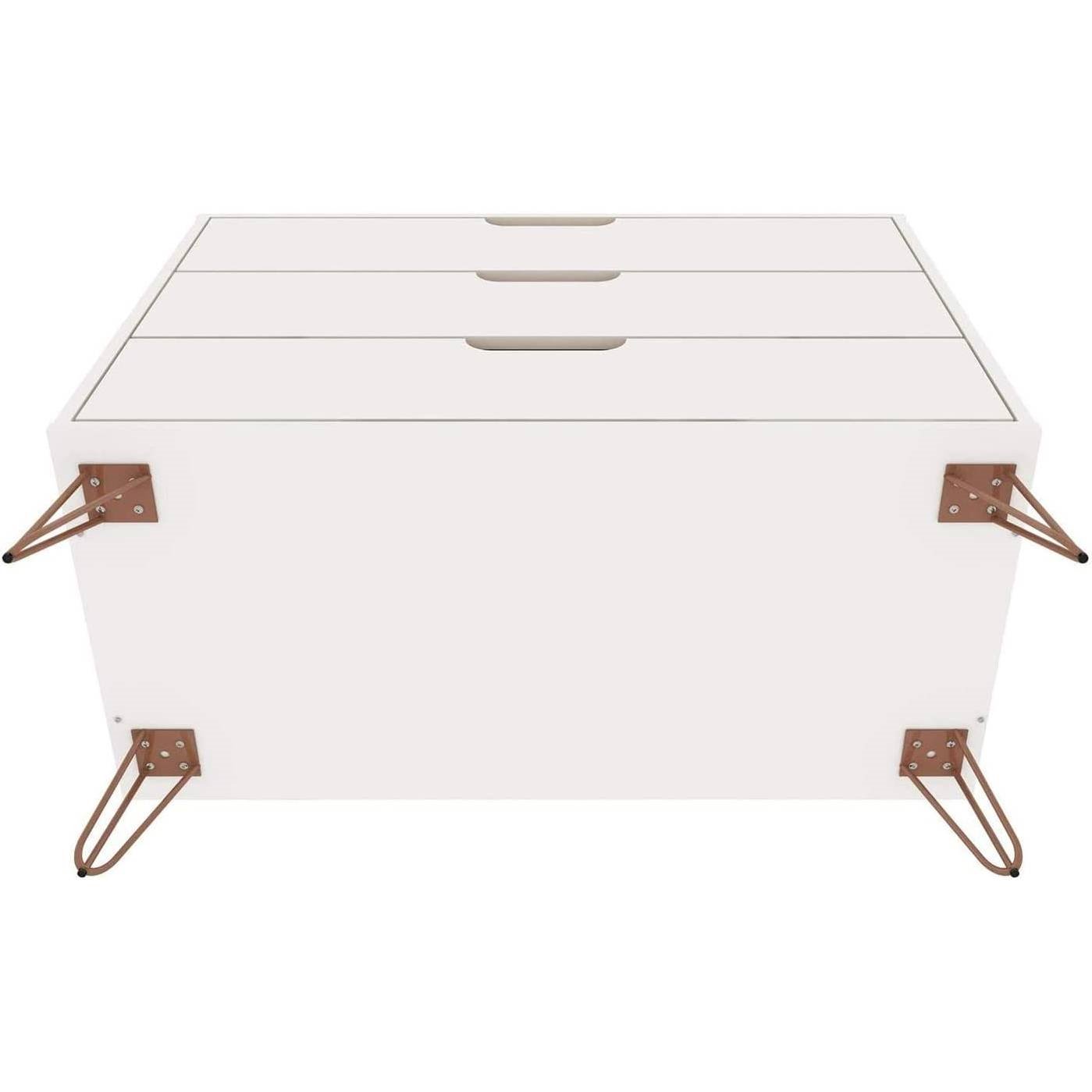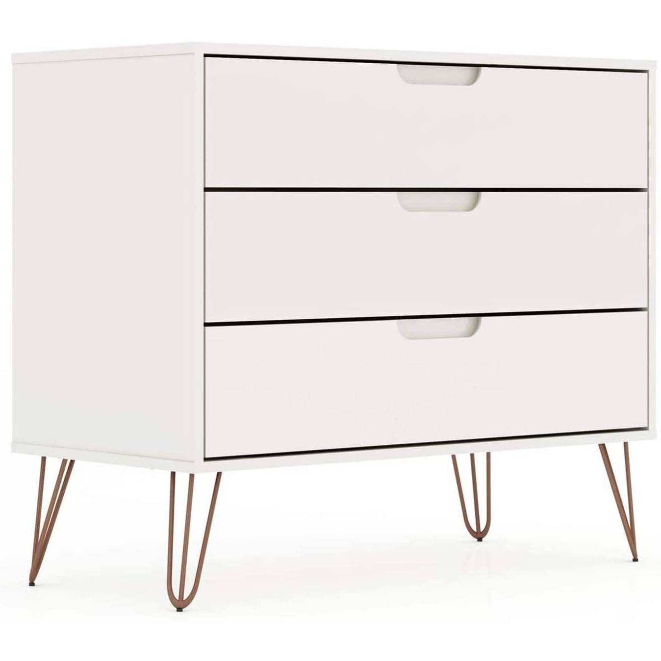 Bring that relaxed flair with this Modern Scandinavian Style Bedroom 3-Drawer Dresser in White Wood Finish. The dresser measures 35. 24" L in. x 17. 52" W in. x 28. 86" H in. and weighs 65. 56 lbs. This dresser is crafted from durable MDF and metal. A perfect piece for your living space, the dresser has three spacious pullout drawers to store clothing and other essentials. Features a stylish Midcentury design with splayed hairpin metal legs. The spacious table top is a great place for a lamp, a vase, framed photos, and travel trinkets. Manhattan Comfort, a developing furniture company based in New York City, began with the goal of bringing modern and stylish furniture to living rooms nationwide. Gradually becoming a household name, Manhattan Comfort creates quality furniture through a production process that ensures each piece created is flawless. We highly value our customers' satisfaction, and we are committed to continually offering contemporary high-quality furniture at affordable prices.