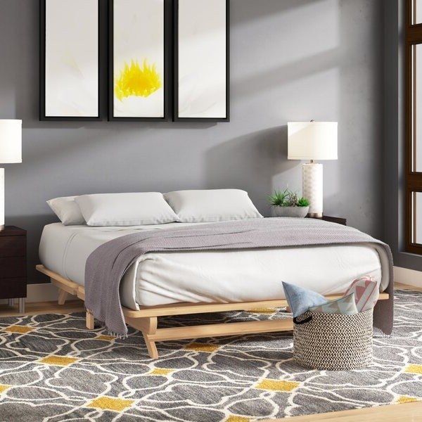 Ideal for any bedroom this Farmhouse Queen Size Solid Wood Platform Bed Made in USA features a simple, versatile silhouette. Crafted from solid poplar wood, this frame comes smooth and unfinished and can be painted or stained for a more customized look. Its low-profile frame features built-in slats to cradle your mattress, so there’s no need to add the usual box spring. If it’s time to redecorate or move apartments, this design folds in half for easy transportation.