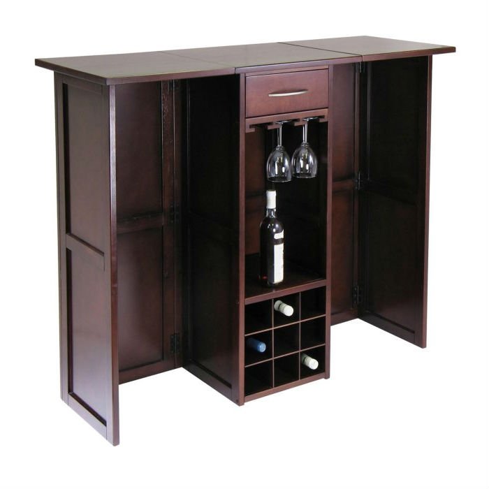 Save space and always be entertaining-ready with the 9 Bottle Walnut Wine Bottle Rack Mini Bar Expandable Counter. This handily expandable bar extends from a compact tower to a bar measuring just over four feet. Whether open or closed it offers a space on top to mix drinks and a variety of smart storage tucked below. Storage features include three wood stemware racks, one spacious drawer, an open shelf, and nine wine bottle cubbies. This wood bar counter comes in a versatile walnut finish.