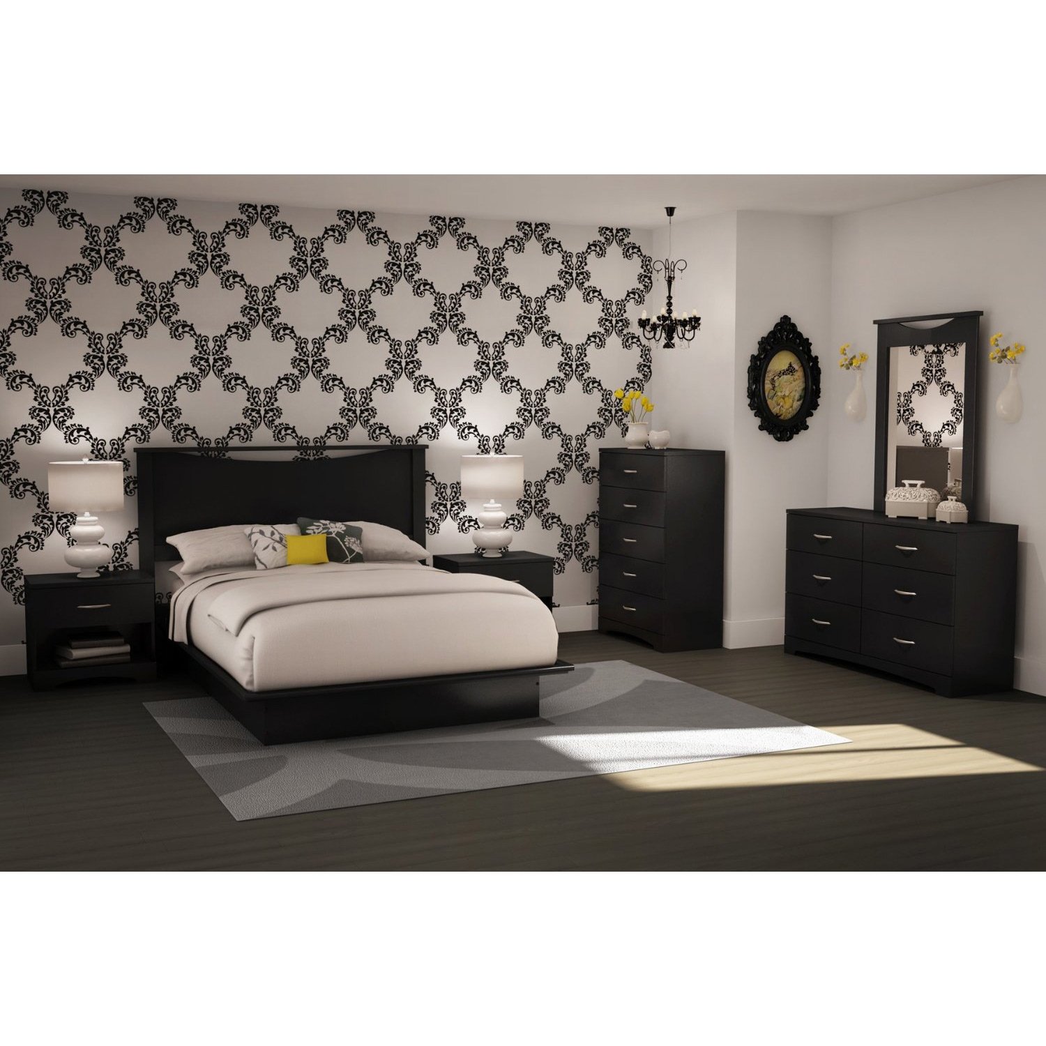 This Modern 5-Drawer Bedroom Chest in Black Wood Finish of bedroom furniture, provides storage for jeans, shirts, socks, and undergarments in its five drawers. A great addition to a small room, the chest also can be paired with the matching collection double dresser for more extensive storage. With its clean lines and simple design, the sleek chest of drawers blends well in modern and transitional bedrooms.  The certified Environmentally Preferred Product (EPP) chest is crafted out of engineered wood and recycled fiber materials, with a pure black finish. Profiled edges and a gently curved kick plate create a distinct look. Using the silver loop handles, the drawers open with ease on durable Smart Glide tracks; stops and dampers prevent the drawers from slamming or falling out of the chest's body. The chest necessitates adult assembly at home and comes with instructions. For defective parts or workmanship, a five-year limited warranty covers this item upon online registration. The Smart Glide slides benefit from a lifetime warranty. The chest measures 30 inches wide by 16 inches deep by 44 inches tall.